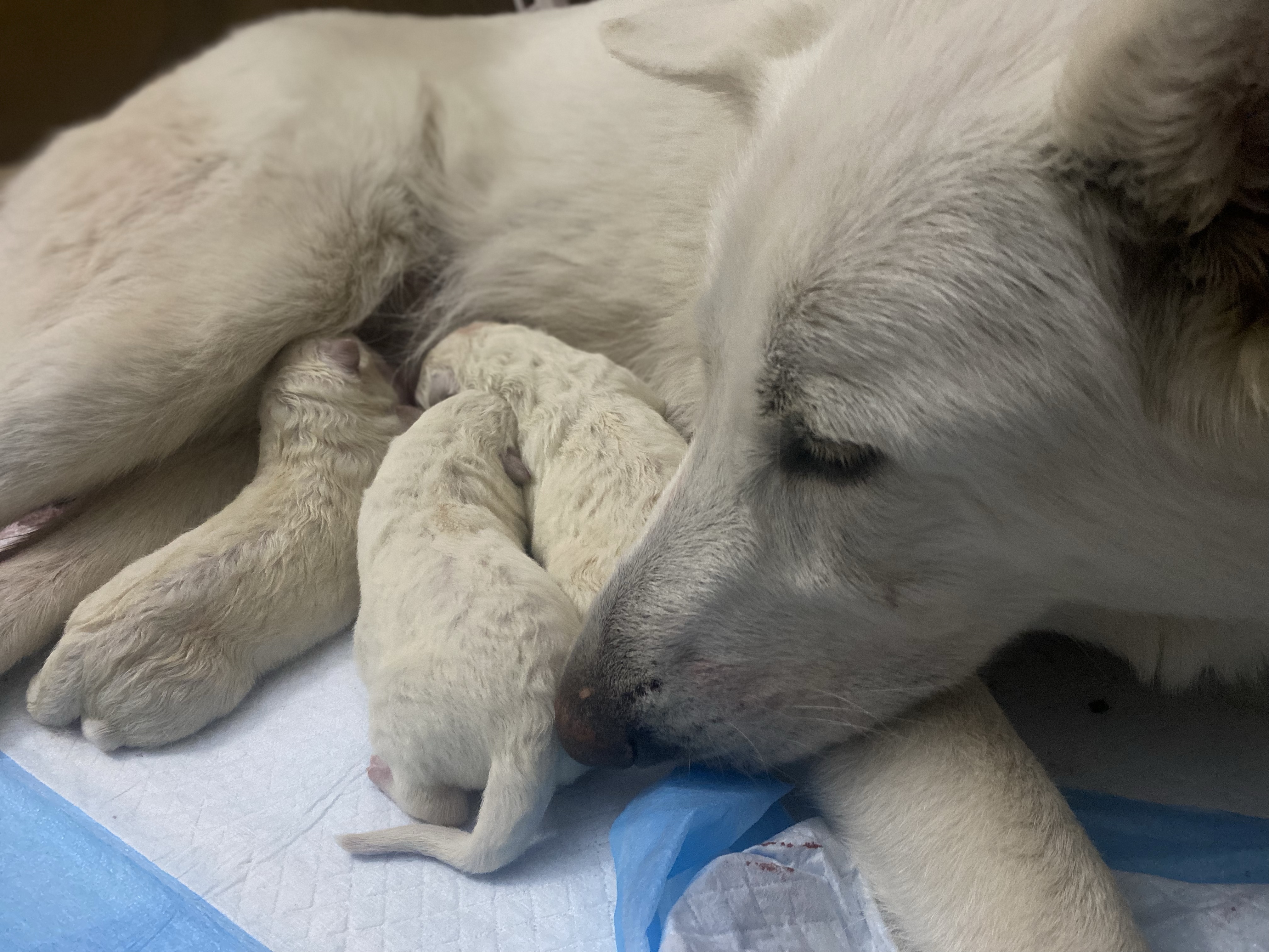 Total puppies: 9 White German Shepherds: 5 (3 females, 2 males) Black German Shepherds: 2 females Sable German Shepherds: 2 males
